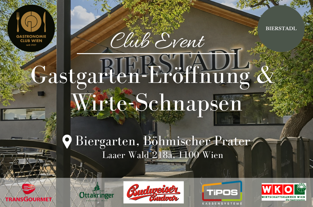 Bierstadl Böhmischer Prater Laaer Wald 218a, 1100 Wien, Wien🌿 Gastgarten-Eröffnung im Bierstadl Der Gastronomie Club Wien lädt zum Club-Event in den Böhmischen Prater ein. Gemeinsam eröffnen wir den Gastgarten im Bierstadl und feiern einen gemütlichen Nachmittag unter Gastronom:innen. Schnaps-Turnier mit attraktivem Hauptgewinn von Budweiser, Ottakringer & Transgourmet Bier-Zapfwettbewerb von Budweiser Präsentation Ottakringer-Trends Live-Musik Biergarten-Atmosphäre pur Glücksrad mit Gewinnen vom böhmischen Prater - genießt […]